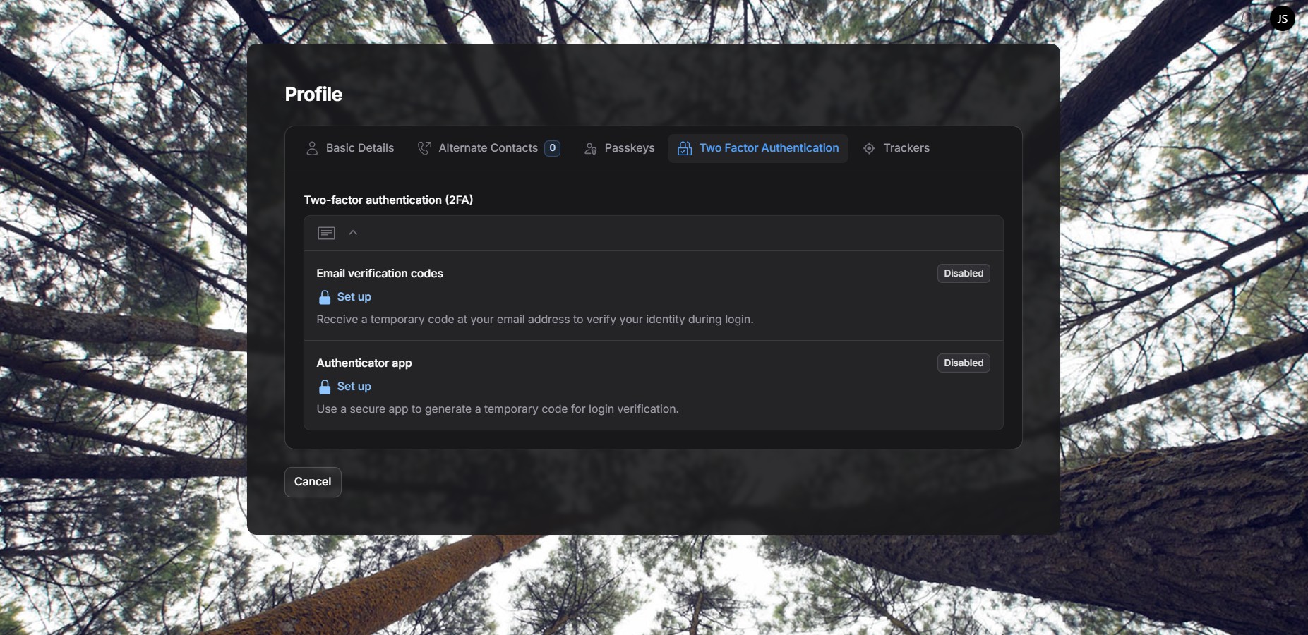 Two-factor authentication helps protect your account even if your password is compromised. You can enable one or both of the available 2FA methods depending on your preference.