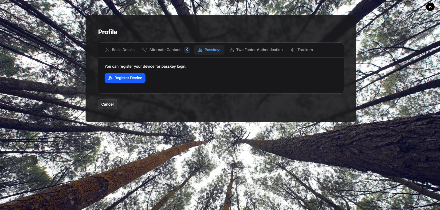 In the Passkeys tab, you can securely register your device for passwordless login using modern authentication methods such as Fingerprint, Face ID, or your device’s built-in security key.