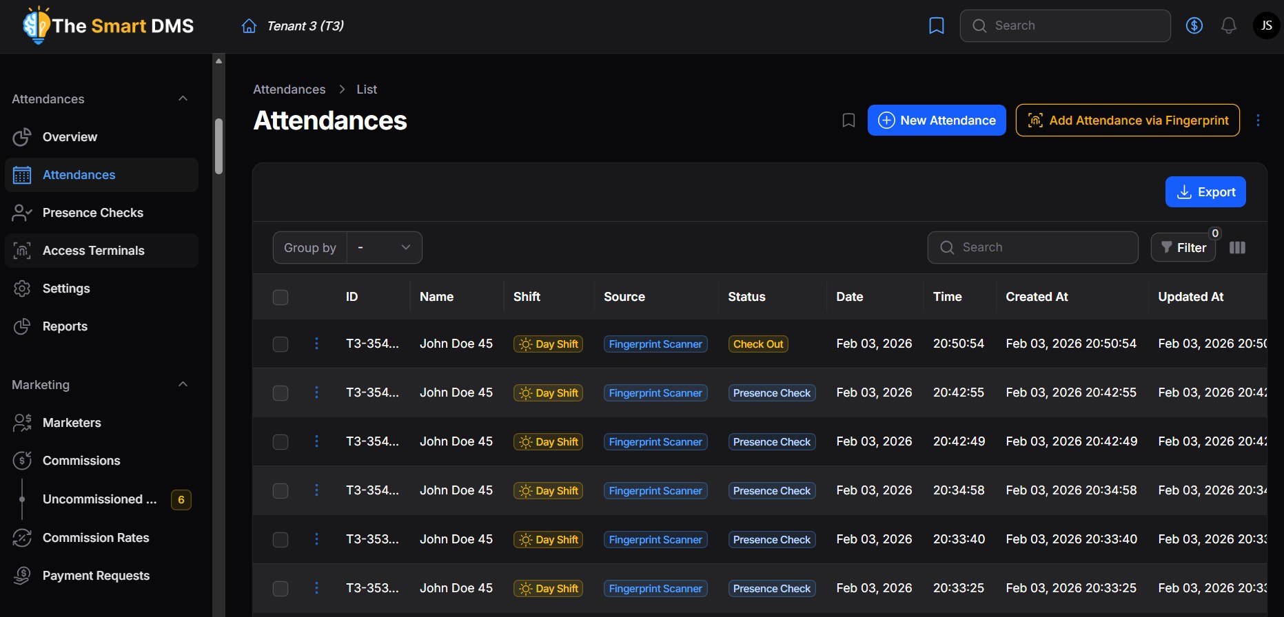 In the Attendances page, you can view all attendance records captured for users within the system.