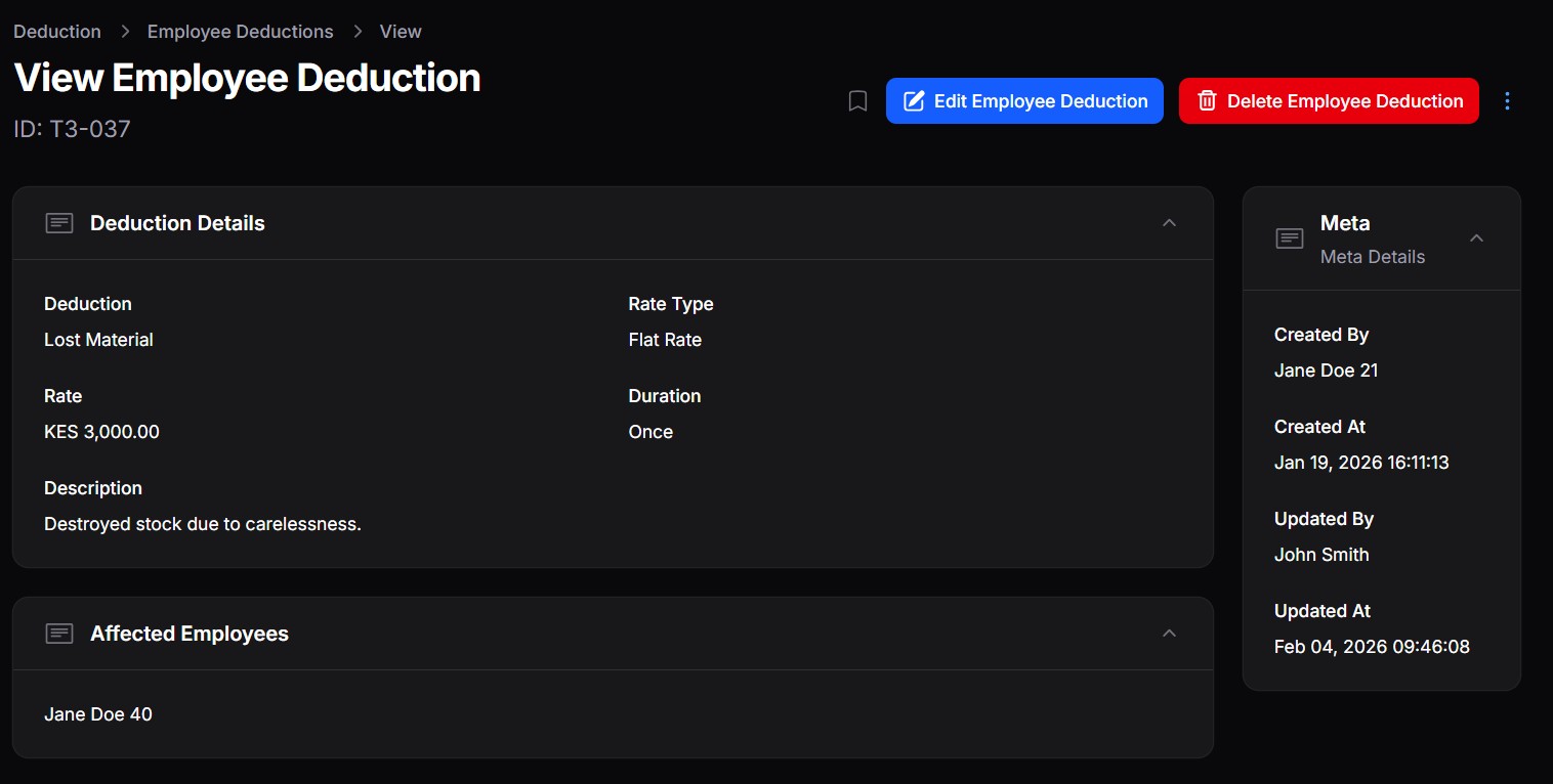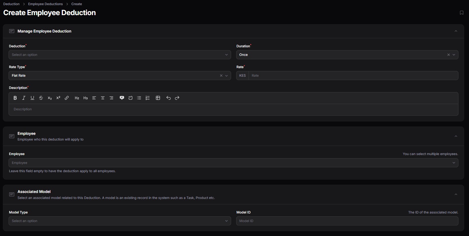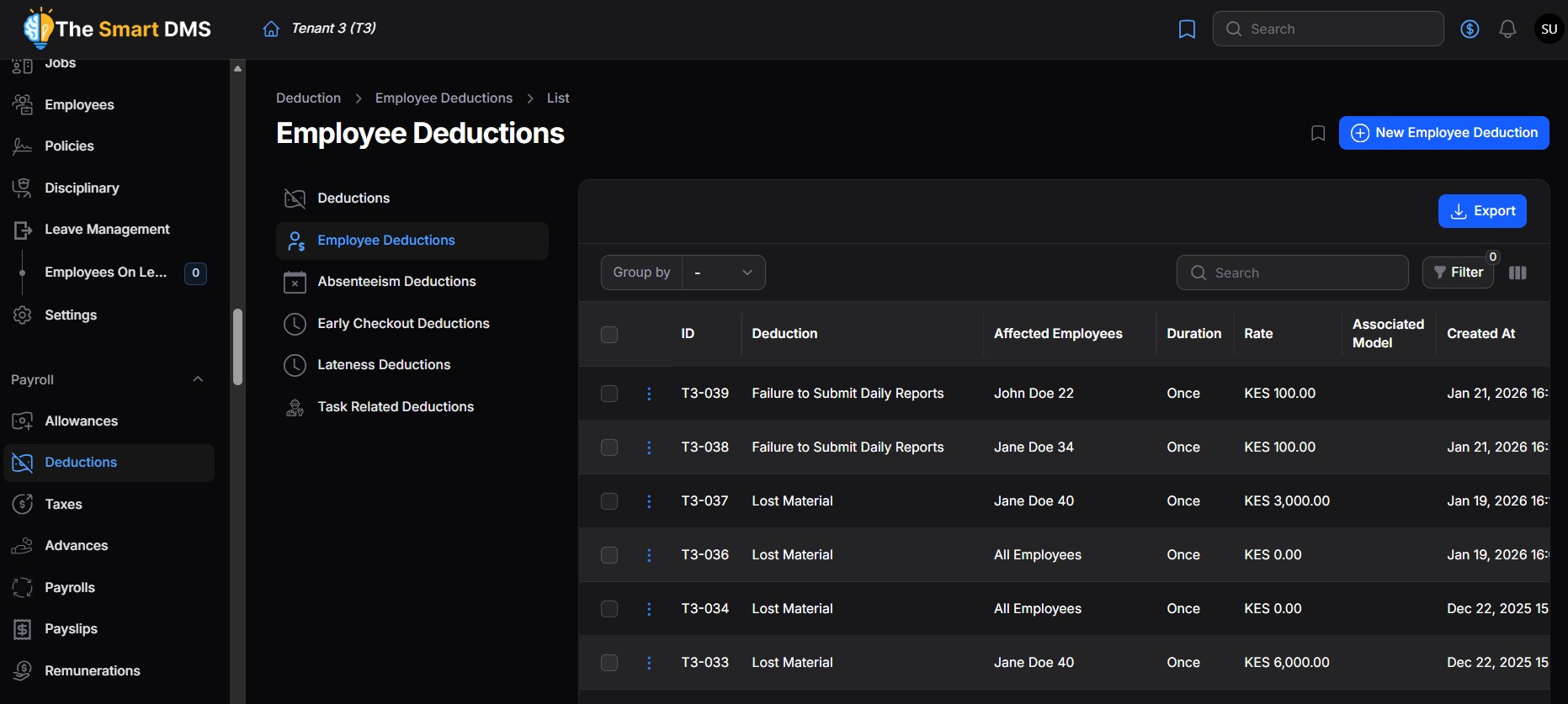 The DMS supports flexible employee deductions that can be applied during payroll processing. Deductions allow you to subtract statutory contributions, taxes, or internal charges from an employee’s gross pay in a controlled and auditable manner.