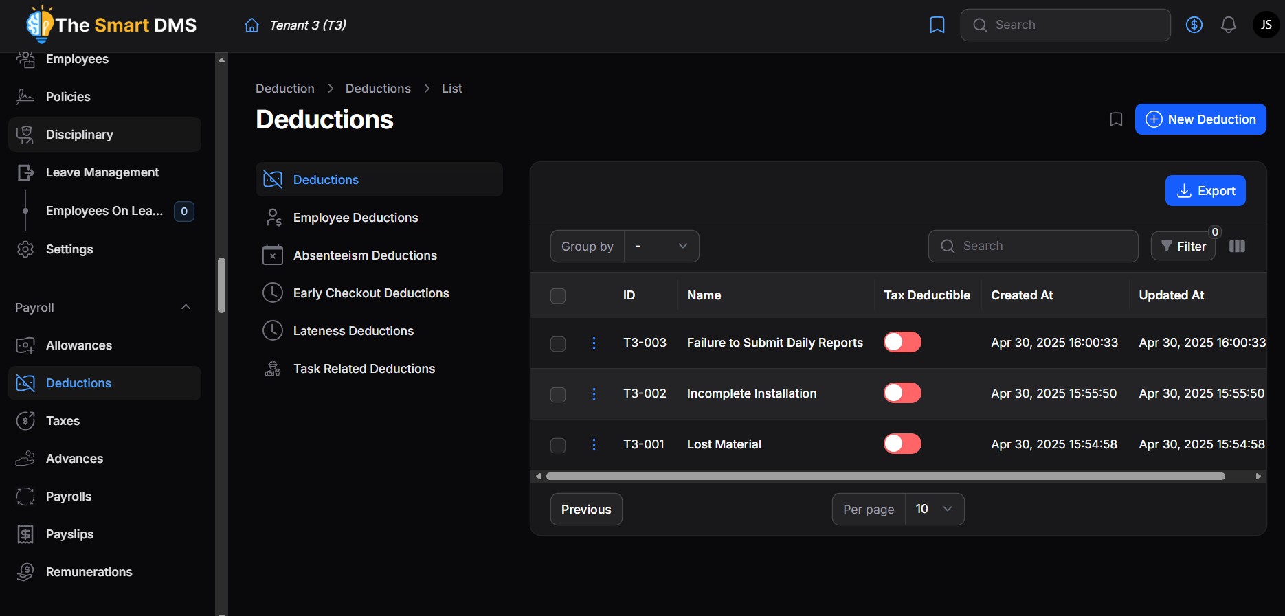 The DMS supports flexible employee deductions that can be applied during payroll processing. Deductions allow you to subtract statutory contributions, taxes, or internal charges from an employee’s gross pay in a controlled and auditable manner.